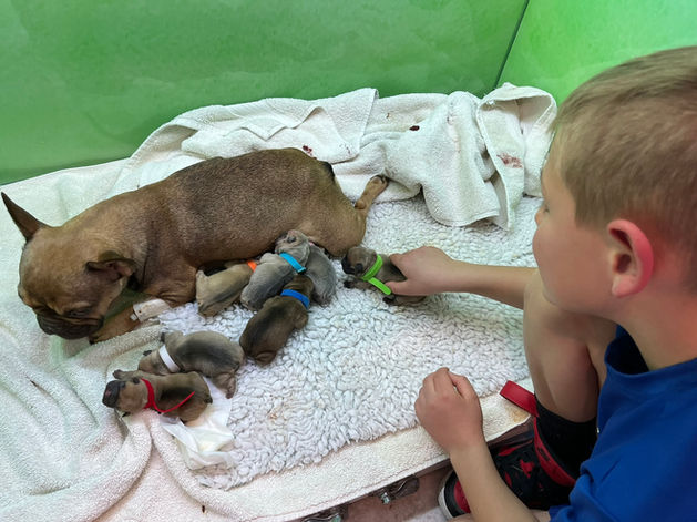 Throughout our lives we've owned many types of dogs in our lives. I mean M-A-N-Y (A beagle, mutts, Labradors, a dalmatian, Great Danes, and a Brittany). Then in 2021, literally on a whim, we got our first French Bulldog, a male. This was before they were deemed the US's most popular breed. But we get it, America, they are our favorite breed now too. So in 2023 we decided to get another. How about a female this time? Then we decided to embark on breeding and share the joy of the French Bulldog with the world. I kid, I kid...kinda. We were curious about breeding and gave it a shot (with much careful planning, vet advice and checks, and a TON of research). It was an amazing experience. We learned a lot, made a few mistakes, but overall enjoyed it so much that we decided to continue. This is not our bread and butter, we have 'real jobs'. Smoosh Face & Co. exists simply because we are passionate about French Bulldogs and creating ones that are healthy and strong and come from tried-and-true bloodlines.